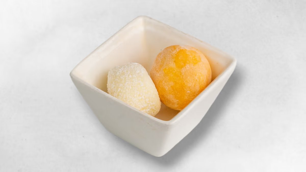 2 piÚces d'un dessert japonais traditionnel en bouchées de seulement 80 kcal qui combine la consistance élastique et moelleuse de la pùte de riz glutineux avec celle, plus corsée, de la crÚme glacée