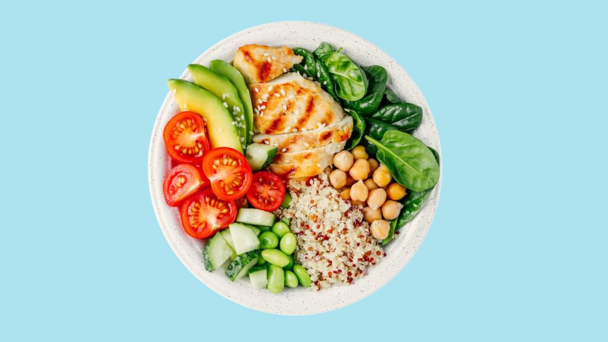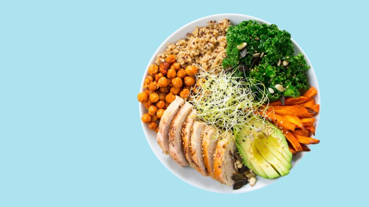 Buddha bowl avec salade, quinoa, pois chiches, poitrine de poulet, avocat, patates douces, graines germées de poireau, noix, sésame et graines.