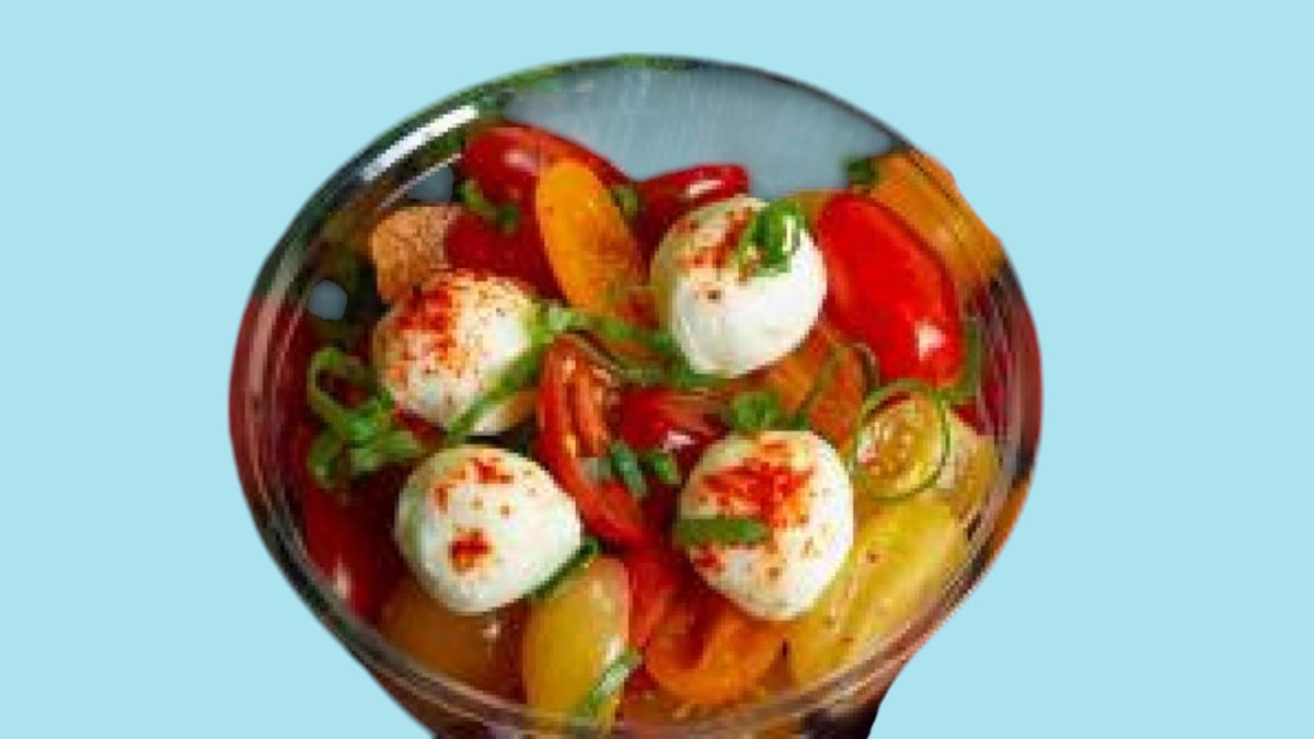 Tomate cerise de couleur, sauce pesto maison, billes mozzarella, ciboulette, fleur de sel, piment d'Espelette AOP et poivre.