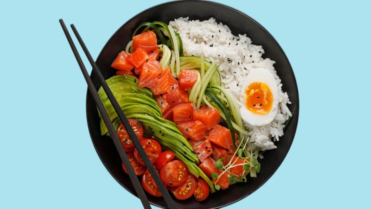 Riz, 1/2 avocat, tomates cerises, SĂ©same noir, Courgettes spaghetti, Saumon Teriyaki, Un demi Ćuf au soja