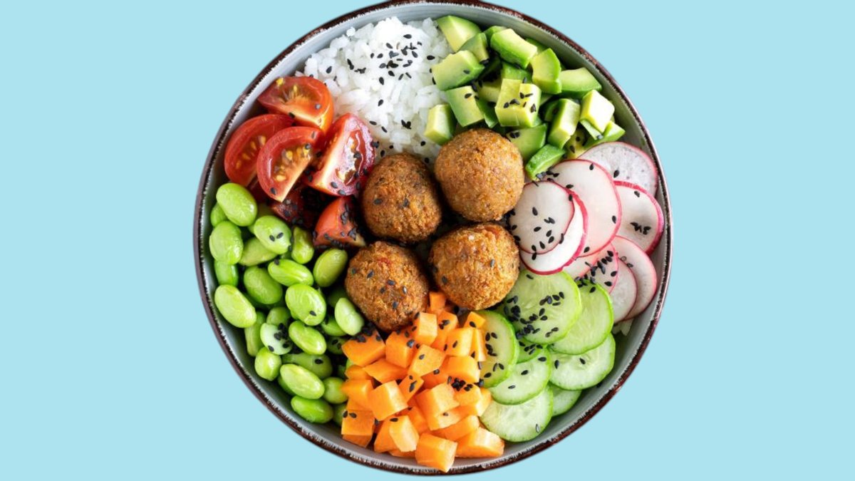 tomates cerises, Edamame, Avocat, Riz au jasmin blanc, Falafel, Sésame noir, Carottes en cubes, Un radis, Concombre