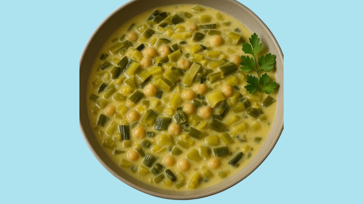 Poireau, pois chiche (de la ferme du jeune chĂȘne), riz complet, crĂšme, sel, Ă©pices.