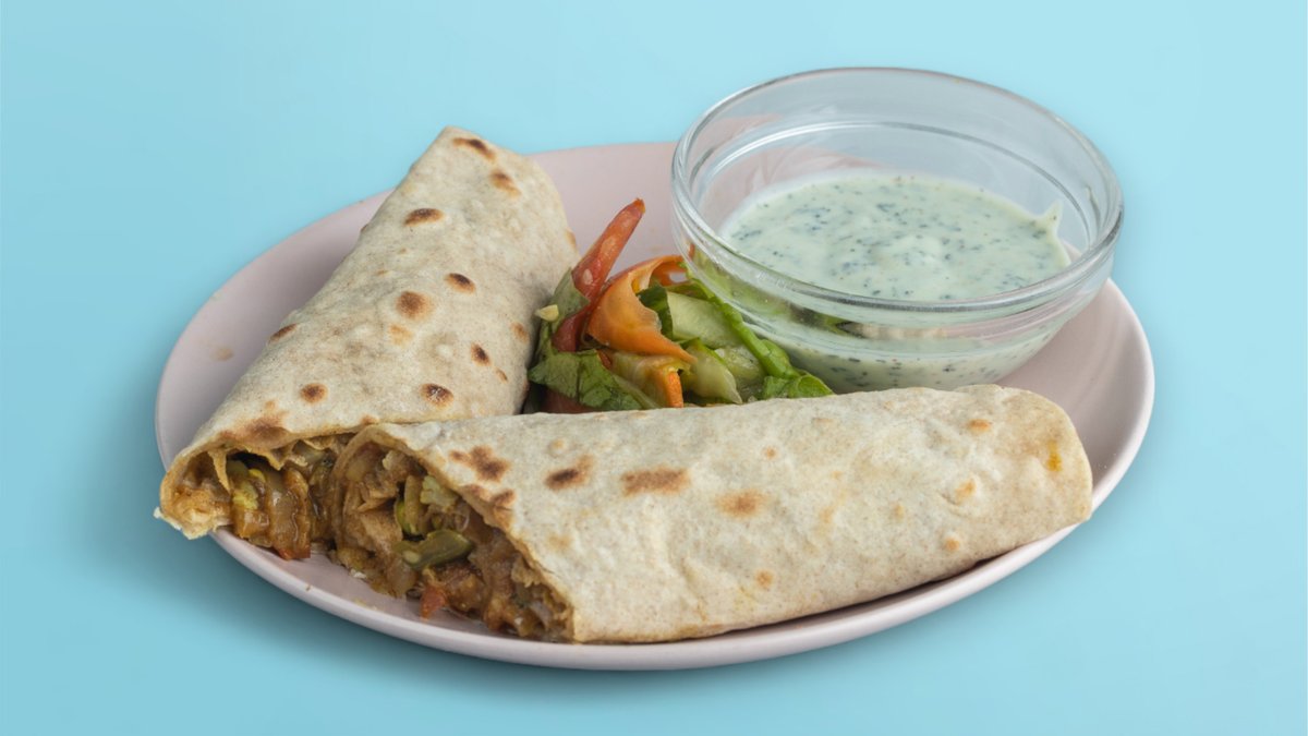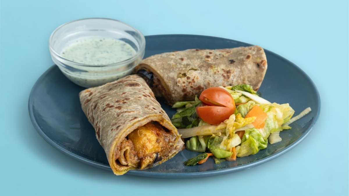 Un petit creux? Essayez la version deluxe de notre wrap – un délicieux pain parantha rempli avec des aubergines aux épices douces masala. Ce plat est huileux, ajoutant une texture riche