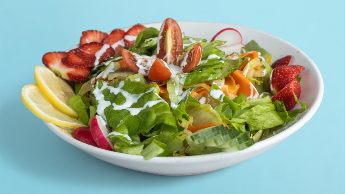 Salade simple fraîchement préparée avec des tomates finement coupées, concombre, carottes et laitue, saupoudrée d’un soupçon de citron, de poivre noir et de sel iodé.