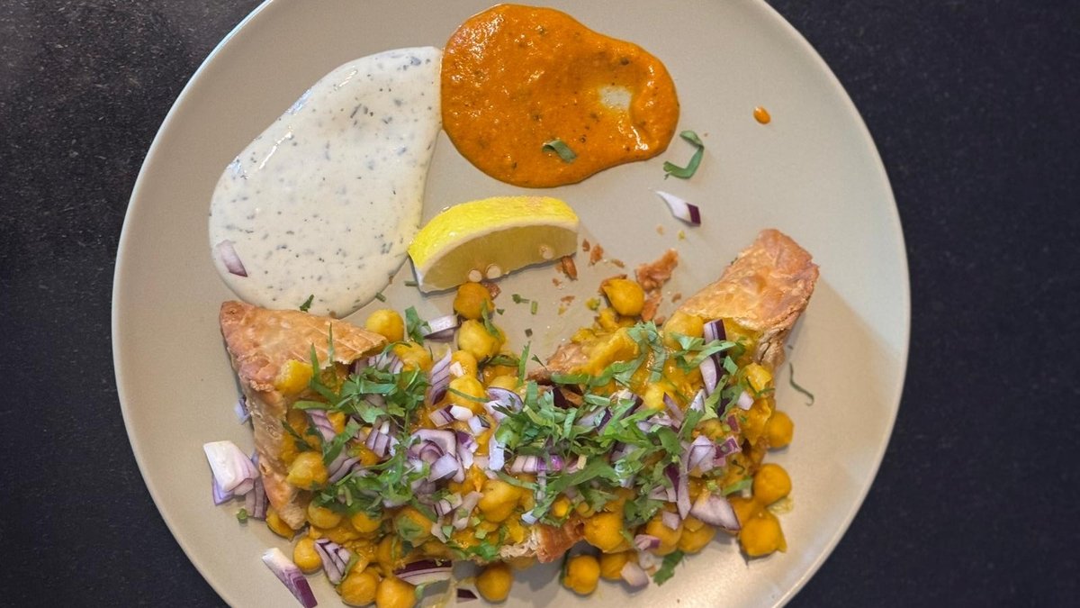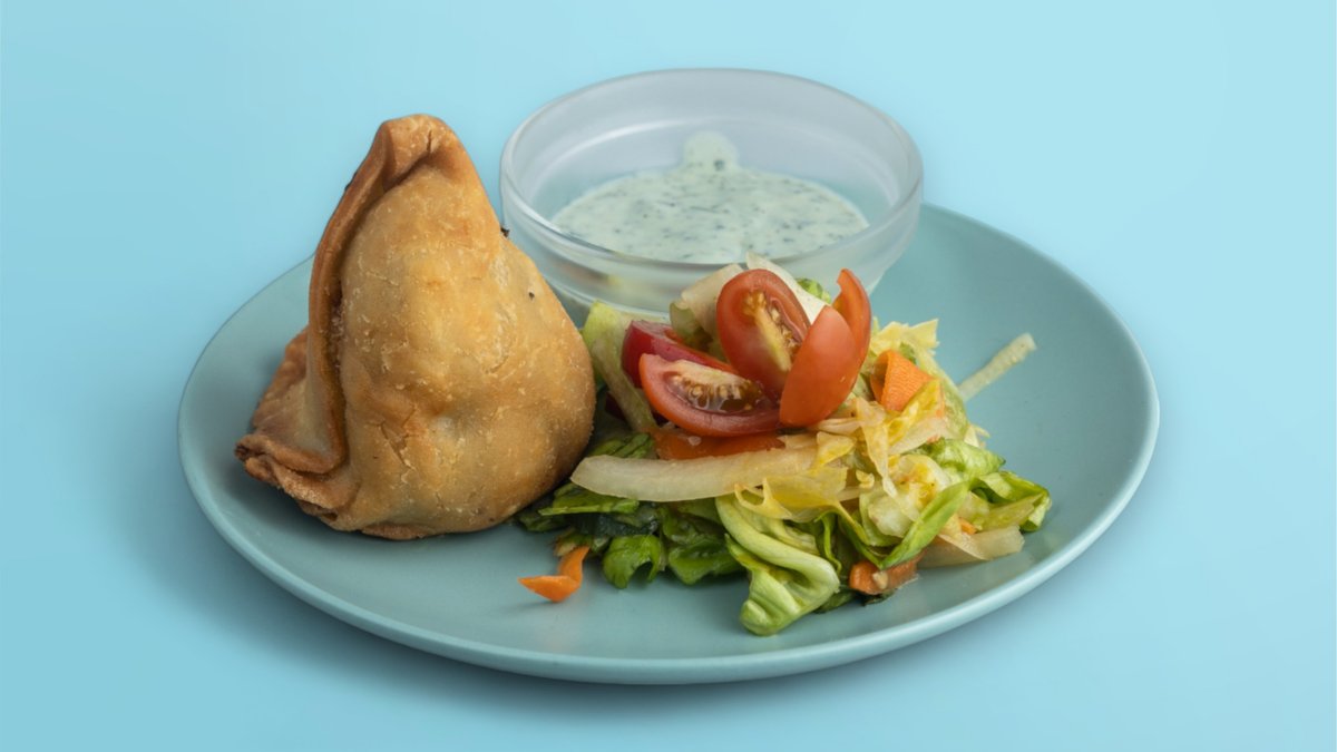 Deux petits triangles de pâte croustillante frits et généreusement remplis avec des petits pois et des pommes de terre épicées. Servi avec deux délicieuses sauces indiennes.