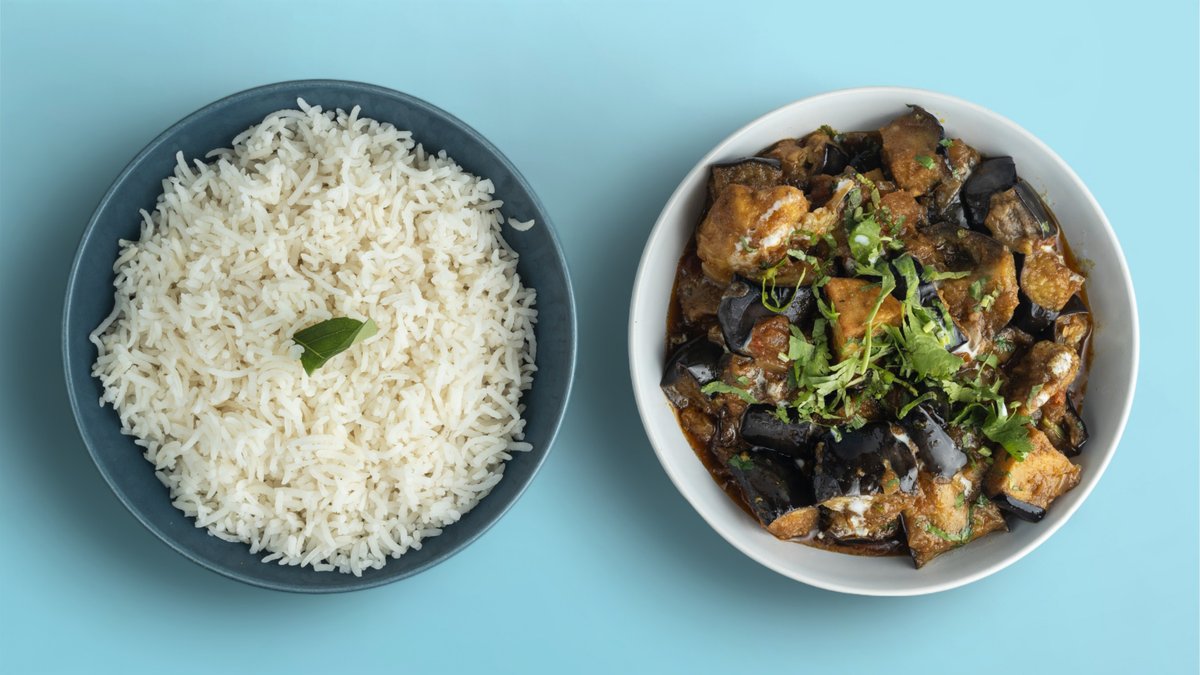 Des morceaux d’aubergine riches et tendres et des pommes de terre épicés au tamarin, au cumin et à la coriandre dans une sauce tomate légère. Servi avec du riz basmati. Ce plat est huileux, ajoutant une texture riche