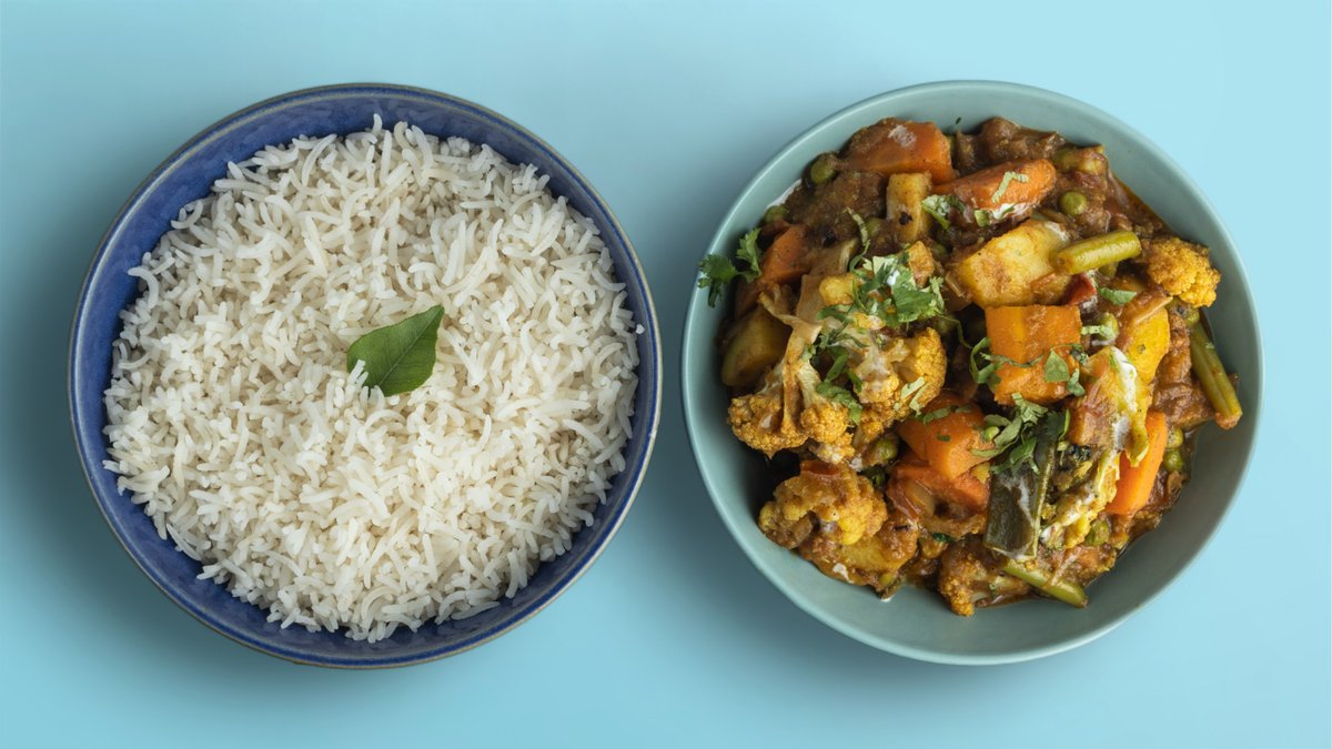 Fleurets de chou-fleur aromatisés au gingembre frais et à l’ail, accompagnés d’une sauce tomate aux épices indiennes et pommes de terre. Servis avec du riz basmati.