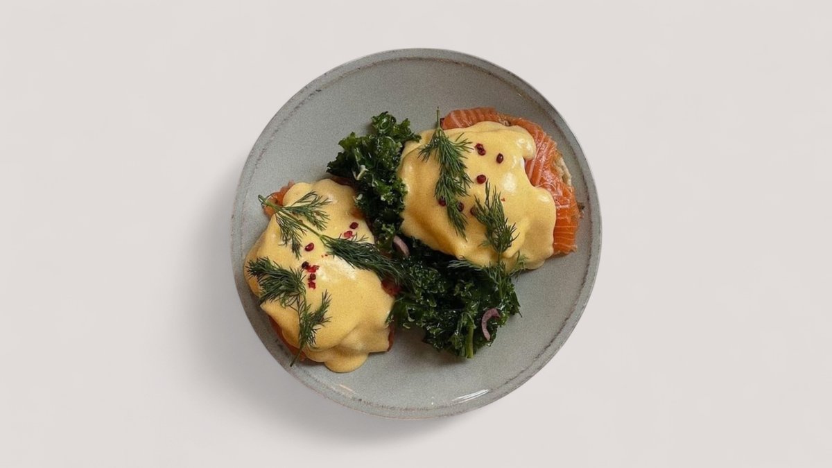 Oeufs bio luxembourgeois, saumon gravlax, hollandaise fumée, aneth