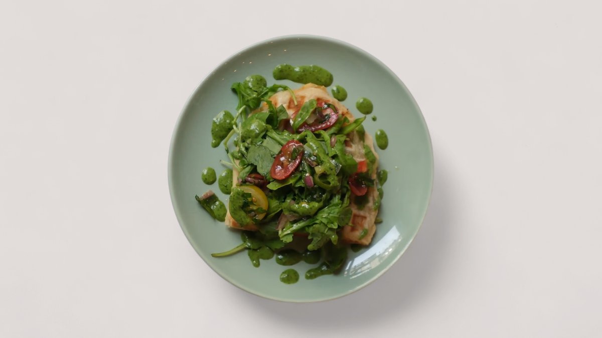 Suprême de poulet jaune aux herbes, épinard, roquette, grenade, fromage de brebis, noix torréfiées, patate douce rôtie, pomme verte