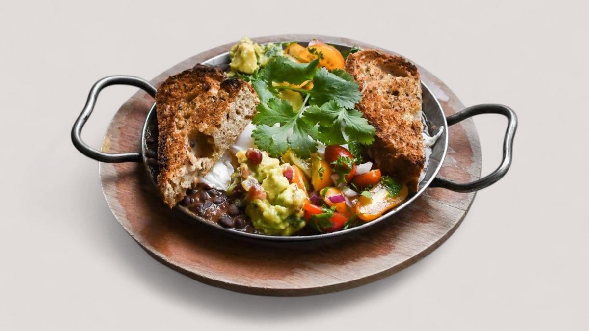 Oeufs bio luxembourgeois, haricots noirs, picco de gallo, guacamole, coriandre, toasts à l’ ail