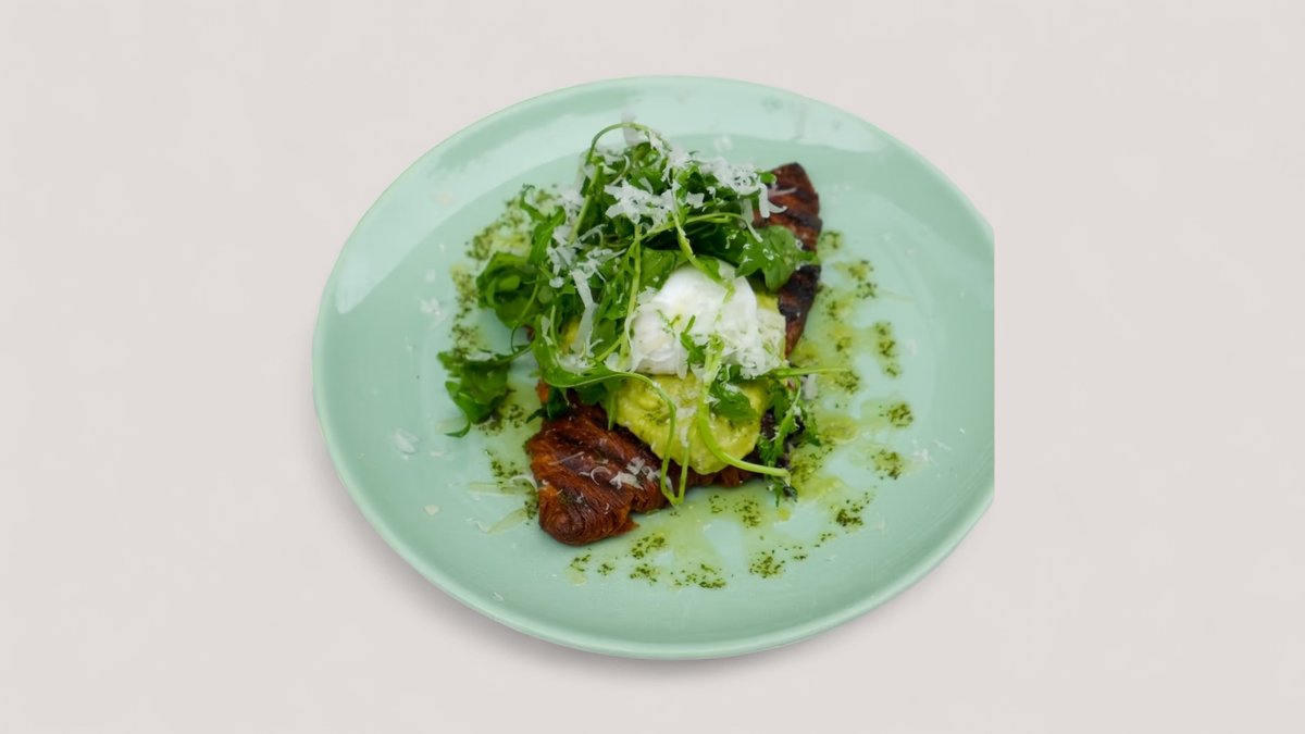 Croissant grillé, guacamole, oeuf poché & parmesan
