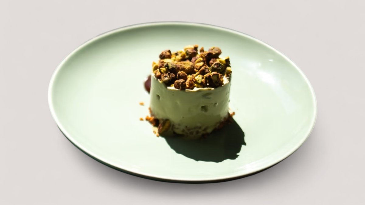 Cream cheese de coco, matcha, praliné de pistache, pistaches concassées, speculoos.