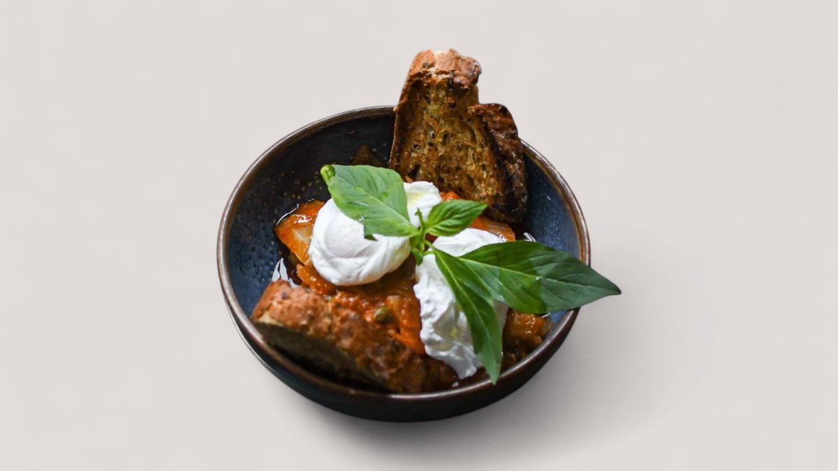 Burrata fondante, asperges, petits pois frais & pesto ail des ours