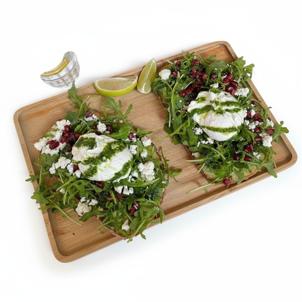Oeufs bio luxembourgeois, toasts avocat, roquette, féta & grenade