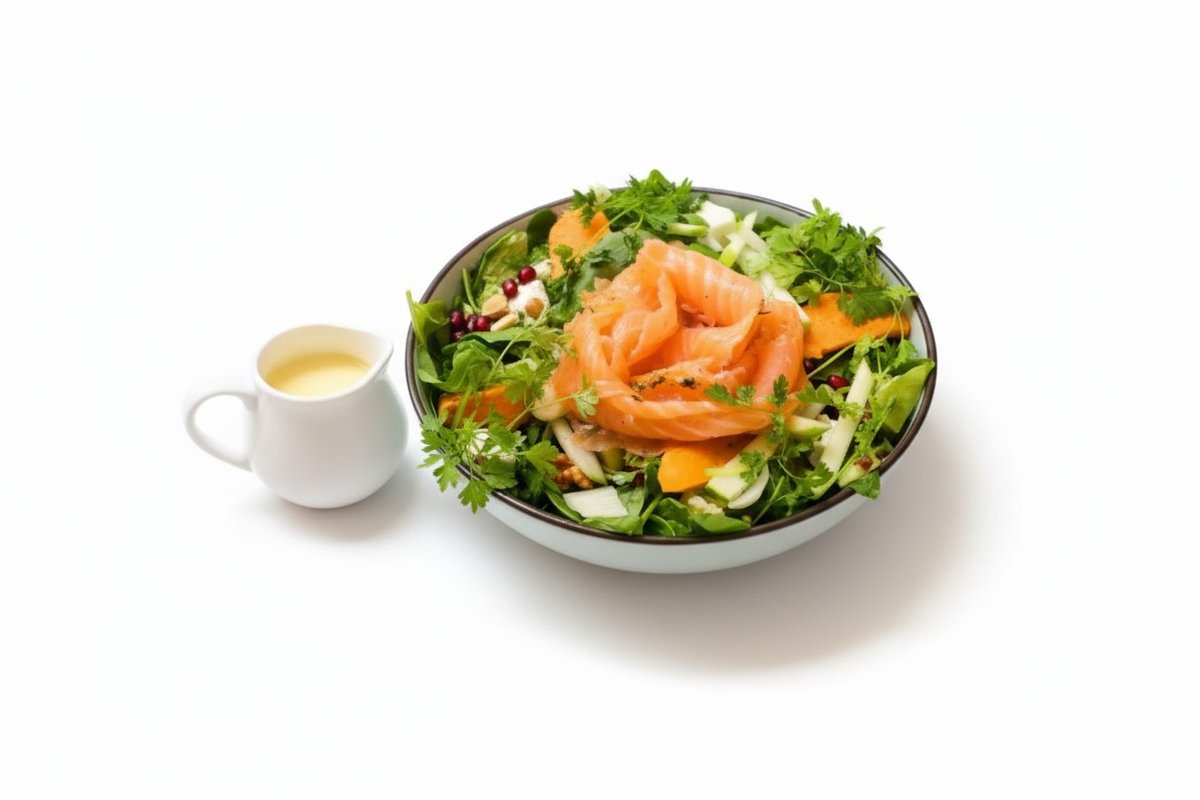 Saumon gravlax, épinard, roquette, grenade, fromage de brebis, noix torréfiées, patate douce rôtie, pomme verte