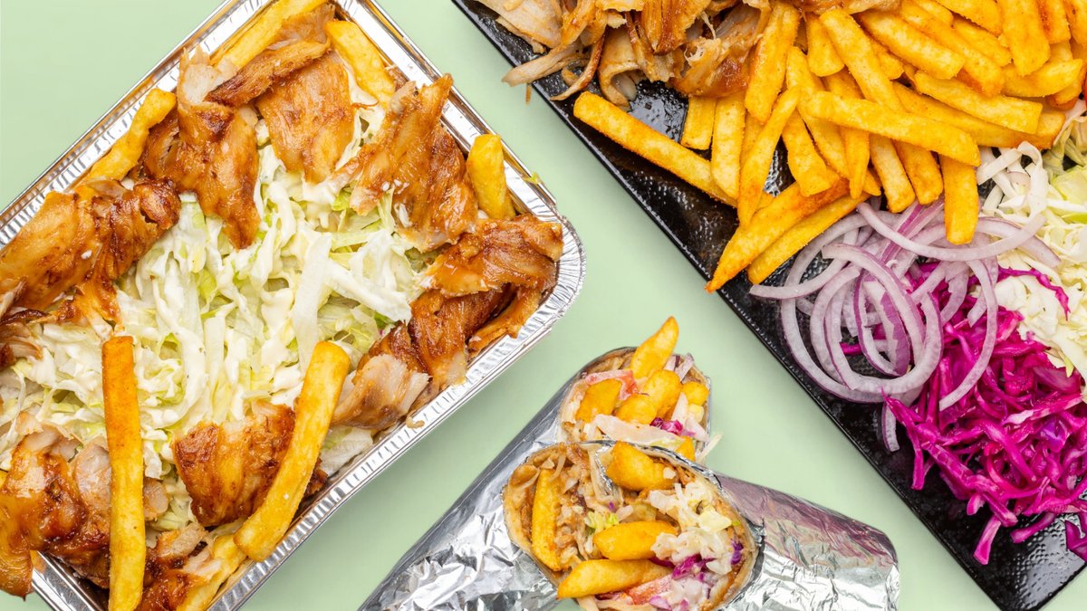 Viande kebab de poulet et dinde servie avec frites et salade.