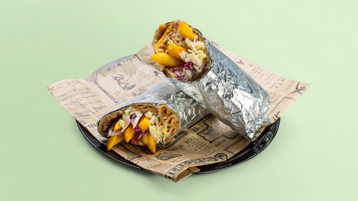 Galette fine enroulée autour de viande kebab de poulet et dinde légumes frais et sauce au choix plus frites a l'intérieur.