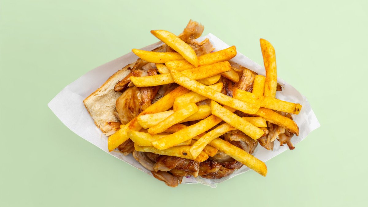 Pain frais garni de viande kebab, salade, tomates, oignons ,chou rouge , chou blanc et sauce au choix avec frites dessus.