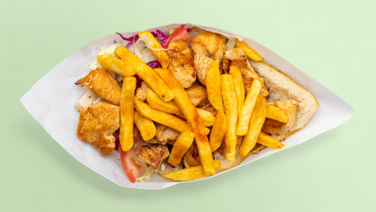 Pain garni de morceaux de poulet marinés et grillés dans du pain frais , servis avec sauce au choix avec frites.