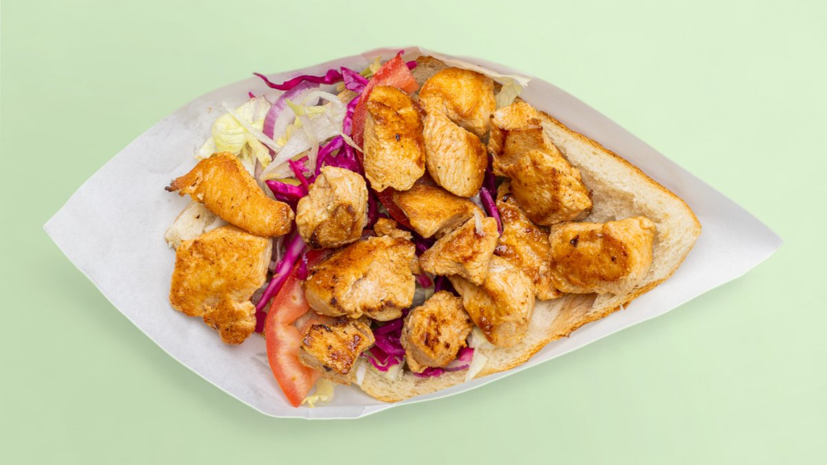 Pain garni de morceaux de poulet marinés et grillés dans du pain frais , servis avec sauce au choix.