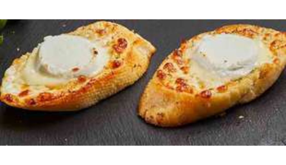 Pain à l'ail, garni de fromage de chèvre et gratiné au fromage mozzarella