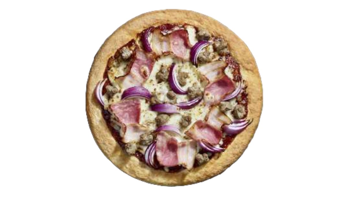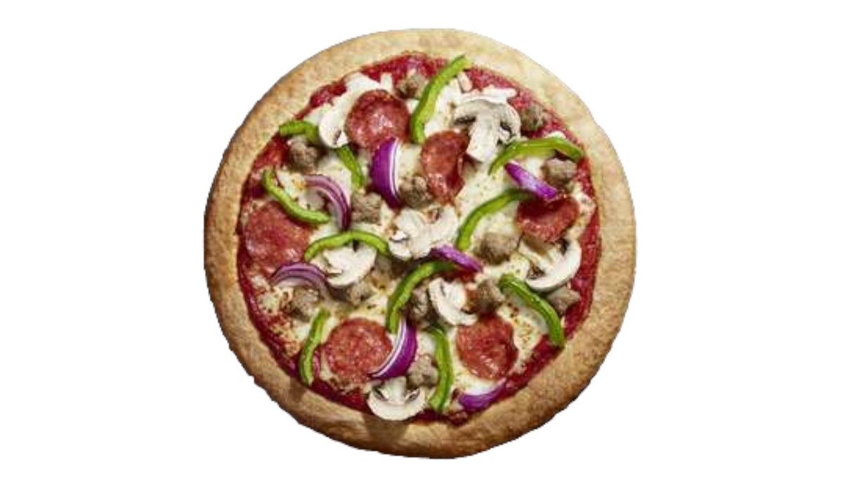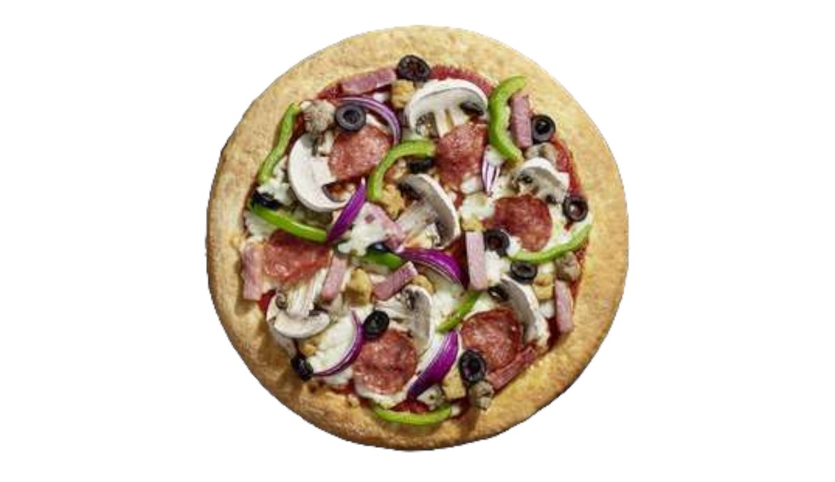 Sauce tomate aux herbes, saucisson pepperoni, oignon rouge, champignon, poivron vert, boeuf aux herbes, porc à l'italienne, jambon cuit, olive noire, mozzarella