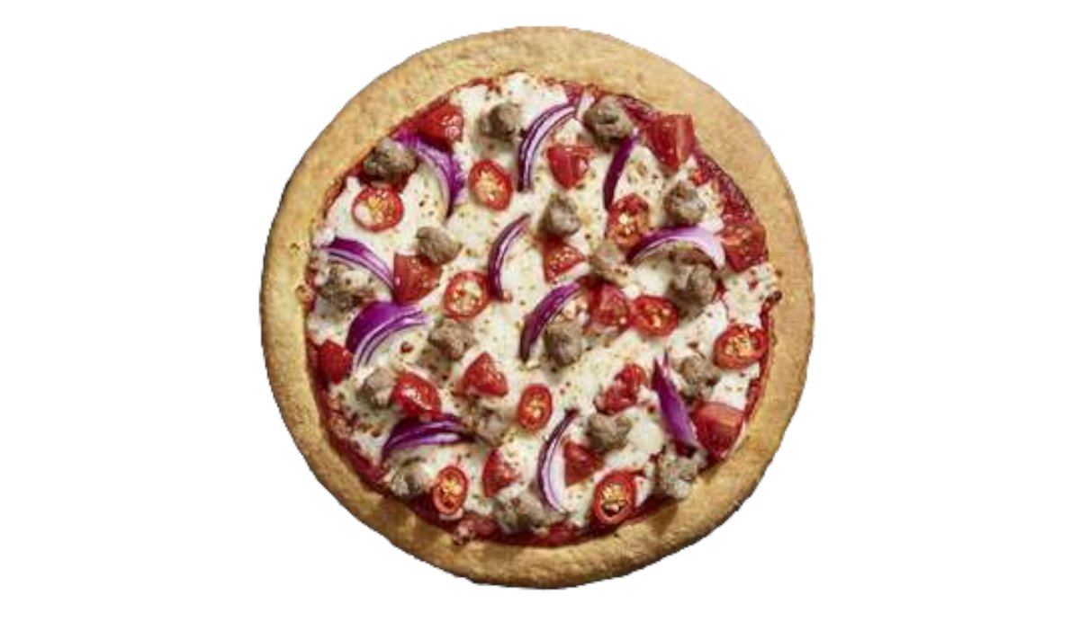 Sauce tomate aux herbes, saucisson pepperoni, oignon rouge, champignon, poivron vert, boeuf aux herbes, mozzarella