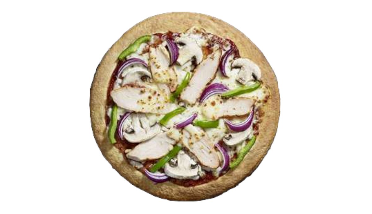 Sauce barbecue, poulet rôti, champignon, poivron vert, oignon rouge, mozzarella