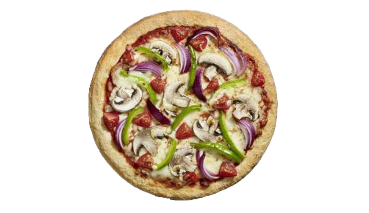 Sauce tomate aux herbes, oignon rouge, champignon, poivron vert, tomate en dés, mozzarella