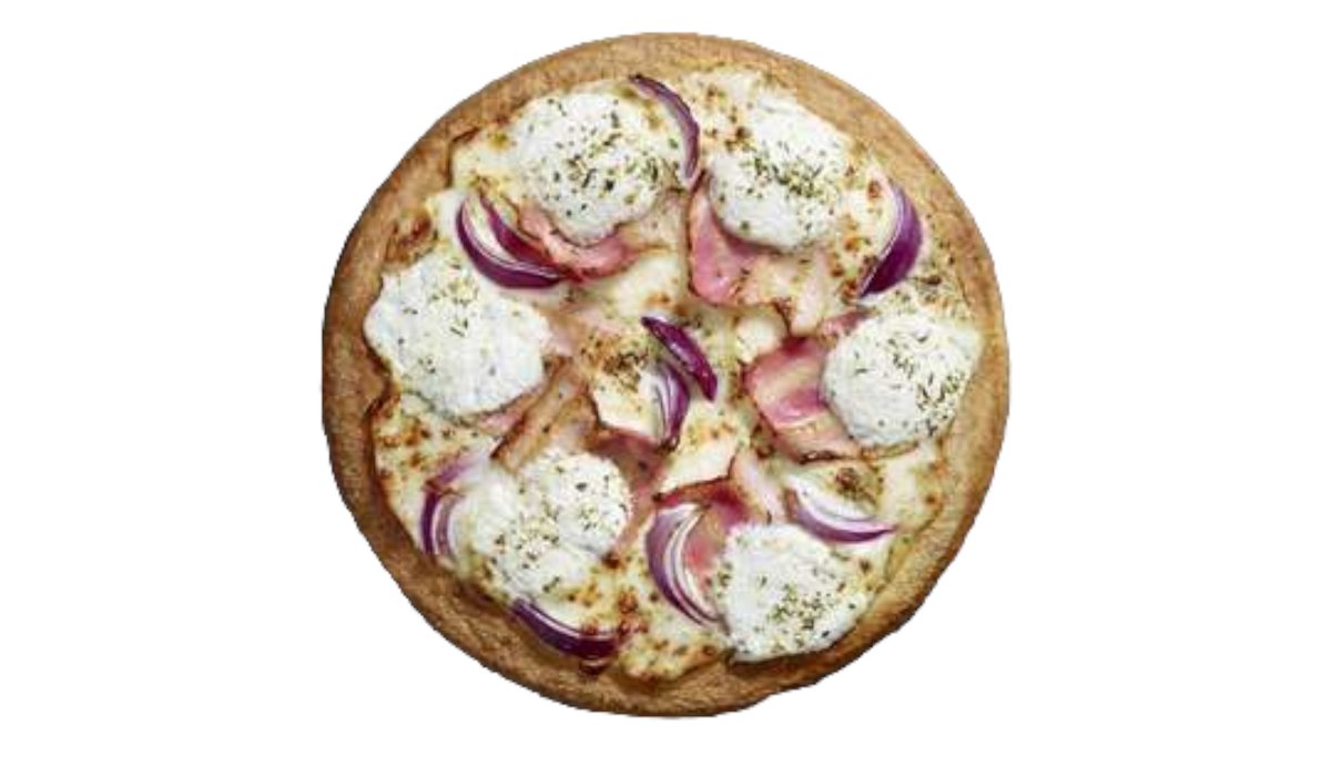 Sauce à l'ail, tranche de lard, oignon rouge, lardon, chèvre, origan, mozzarella