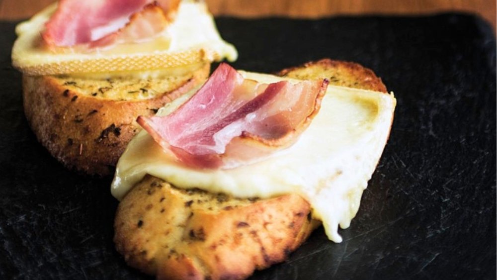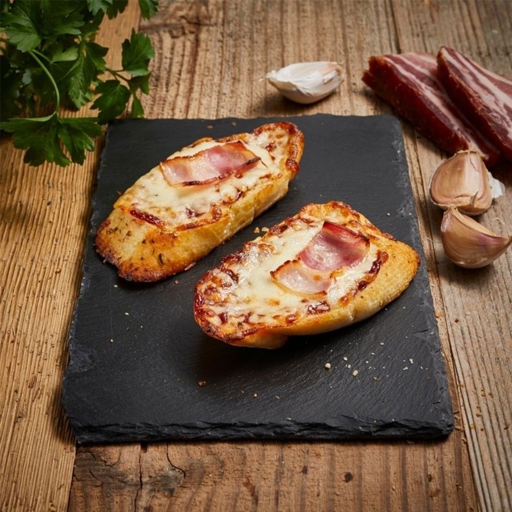 Pain à l'ail, garni de fromage raclette et tranche de lard