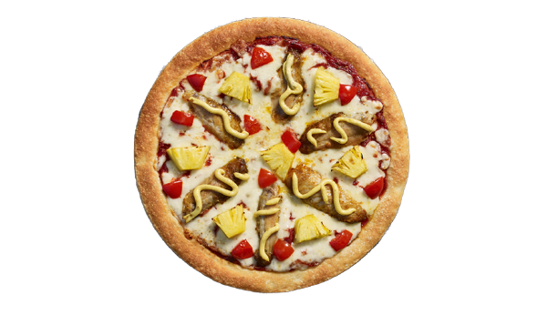 Sauce tomate aux herbes, poulet rôti, ananas caramélisé, dés de tomate, sauce curry, mozzarella