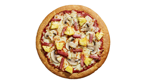 Sauce tomate aux herbes, jambon cuit, champignon, ananas caramélisé, mozzarella