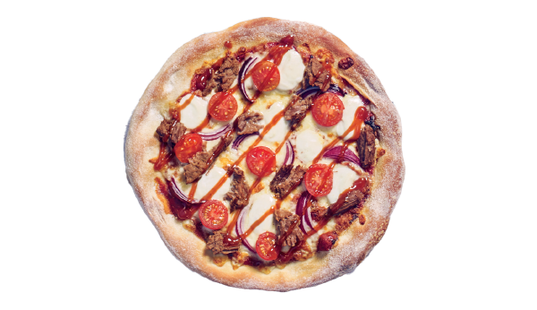 Sauce tomate, mozzarella, sauce bbq, oignon rouge, tomate cerise, boeuf effiloché, boules de mozzarella.