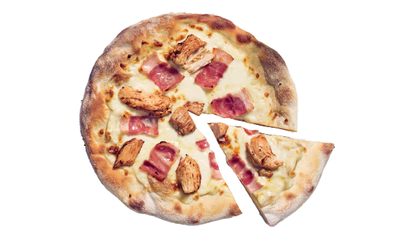 Sauce blanche à l'ail, poulet rôti, lardon, boule de mozzarella, mozzarella