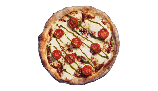 Sauce tomate, mozzarella, tomate cerise, boules de mozzarella, huile parfumée au basilic.