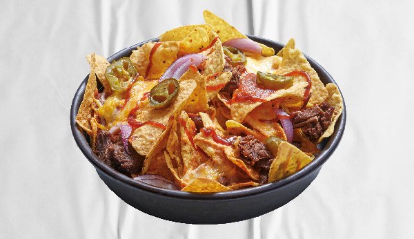 Doritos, sauce marinara salsa, boeuf aux épices Tex Mex, oignons rouges, sauce barbecue, jalapenos, cheddar, gouda