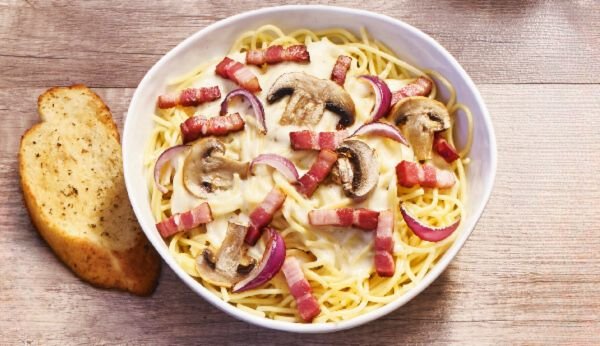 Lardon sauce à l'ail champignon oignon rouge