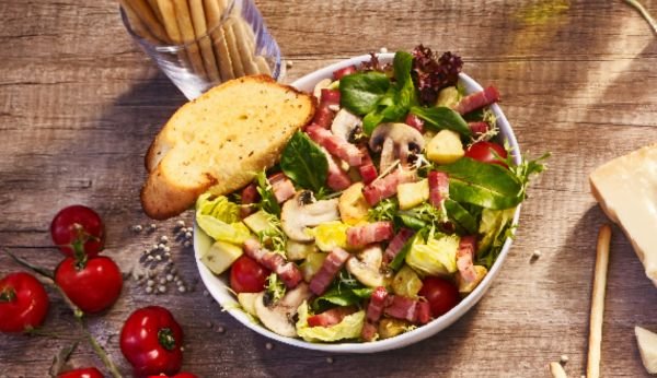 Mélange de salades croquantes tomate cerise lardon pommes de terre rissolée champignons