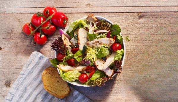 Mélange de salades croquantes tomate cerise poivron grillé aubergine grillée courgette grillée oignon grillé poulet rôti