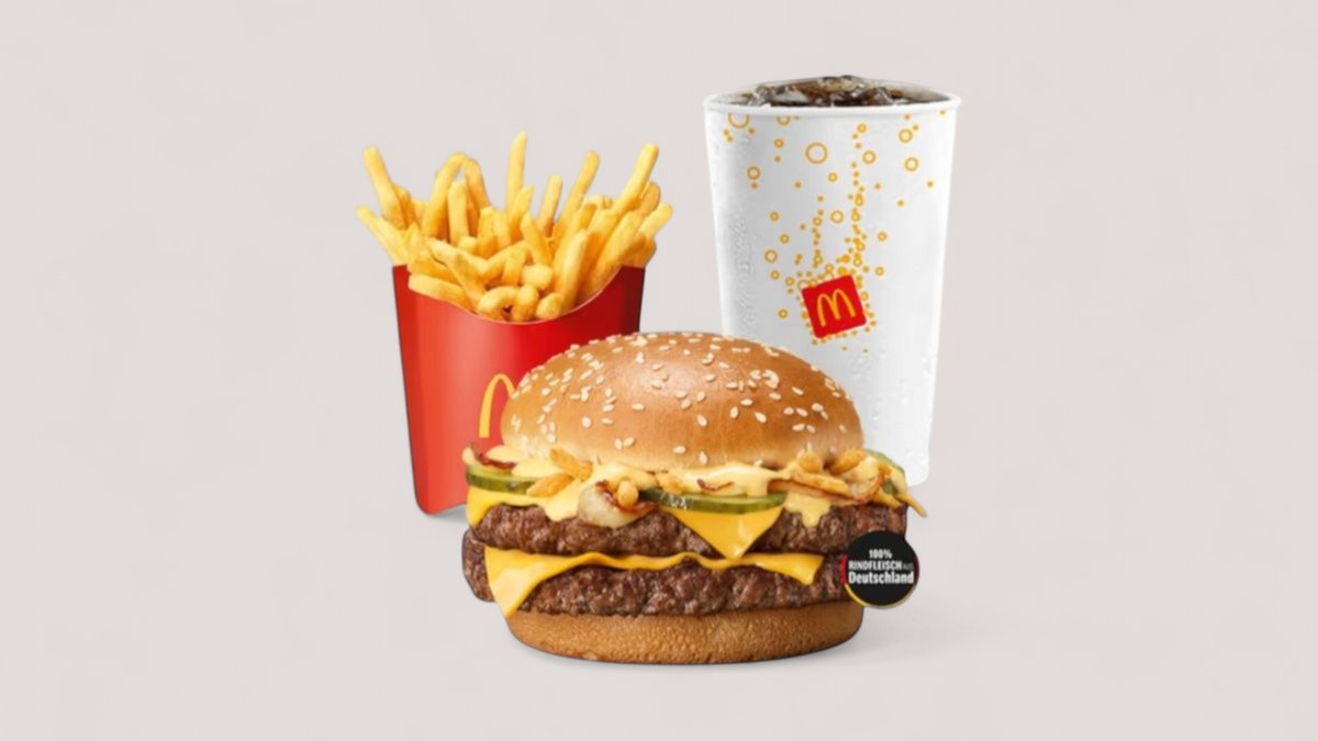 Die absolute Krönung: der Hamburger Doppel Royal Cheese. Gleich zwei Pattys mit 100 % Rindfleisch aus Deutschland, Zwiebeln, würzige Gurken, ein extra fluffiges Bun und zartschmelzender Cheese