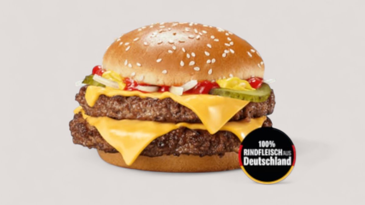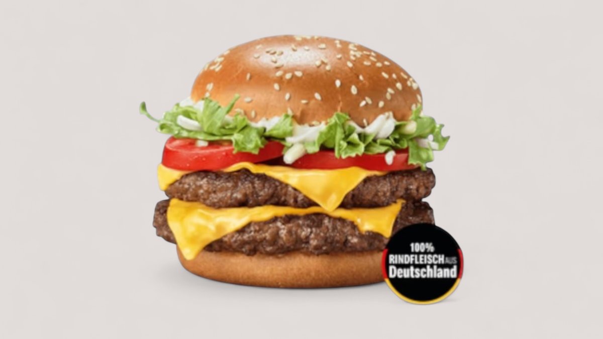 Für den ganz großen Hunger: der Doppel Hamburger Royal TS. Gleich zwei Pattys mit 100 % Rindfleisch aus Deutschland, frischen Tomaten, knackigem Salat, weißen Zwiebeln, cremiger Sauce und zartschmelzendem Cheese, vereint auf einem herrlich fluffigen Sesam- Bun