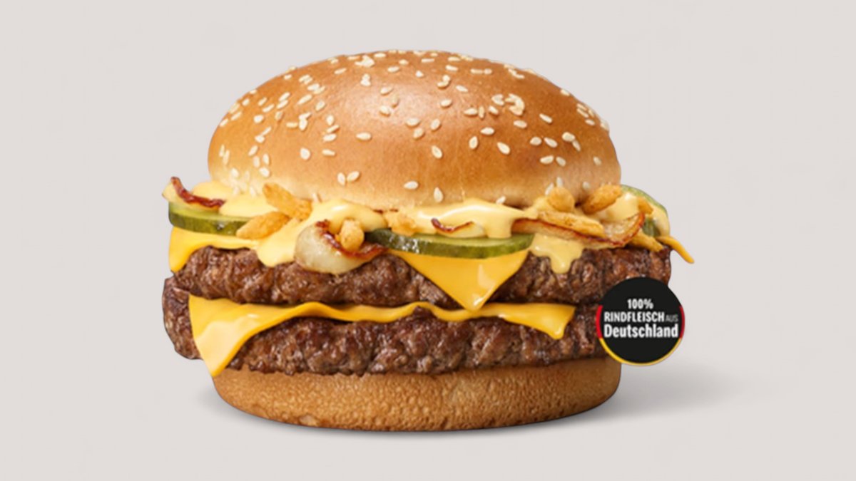 Welcome to Lecker: Der Philly Cheese Stack mit doppelt saftigem Beef, zartschmelzendem Cheese und einer cremigen Cheese-Sauce. Dazu noch würzige Salzgurken, gegrillte Zwiebeln, knusprige Röstzwiebeln und ein fluffiges Sesam-Bun. Also reinbeißen und genießen!