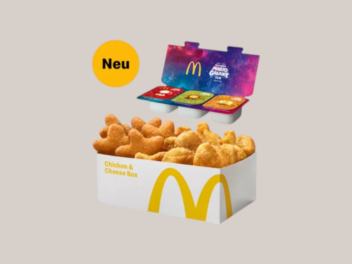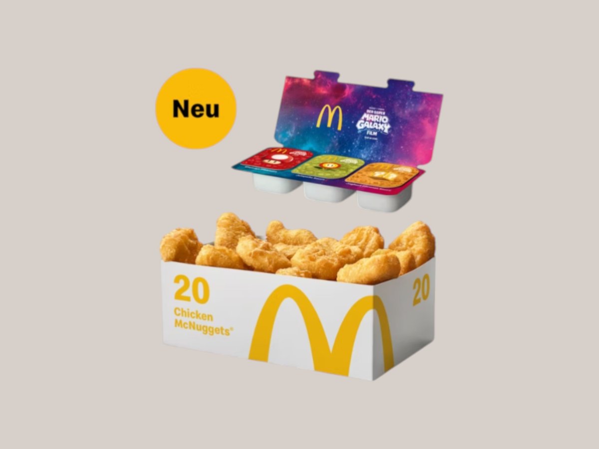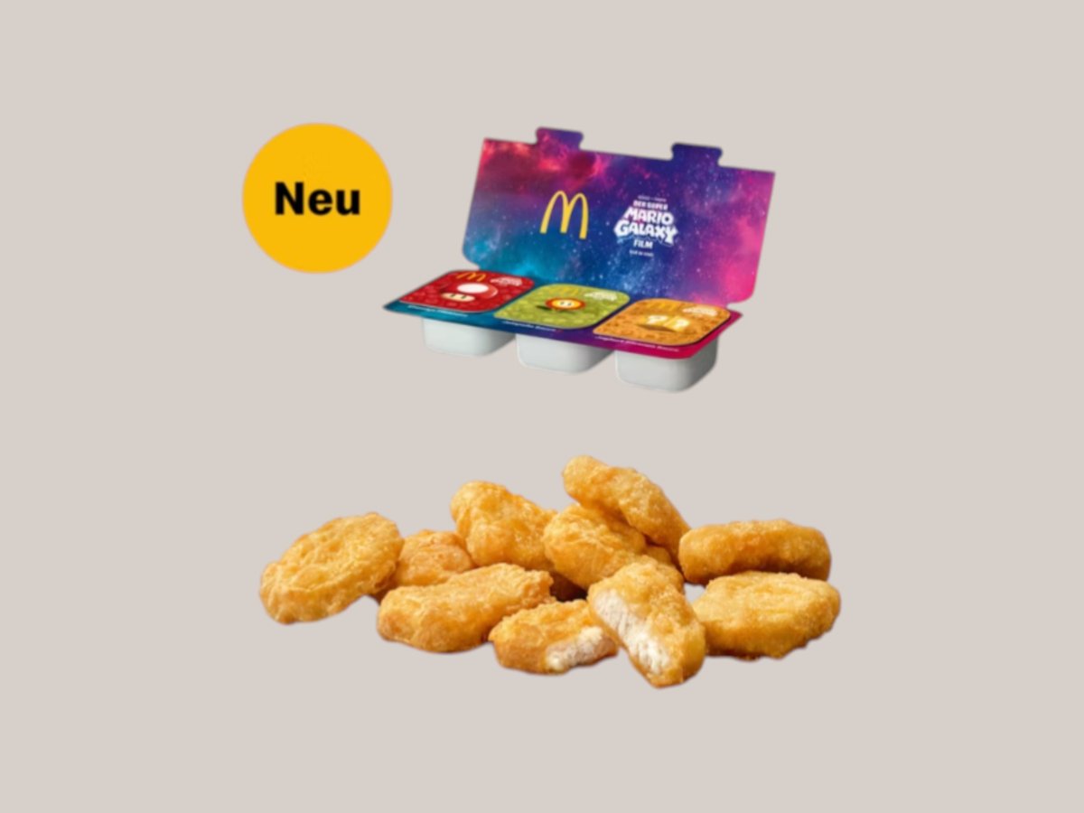 Dieses Dip Set ist vielleicht limitiert, aber dein Genuss ist grenzenlos! Inspiriert vom Super Mario Galaxy Film warten drei himmlisch leckere Saucen darauf, deinen Snacks das gewisse Extra zu verleihen: Probiere jetzt die cremige Pilzsauce, die Jalapeño Sauce und die Joghurt-Zitronen-Sauce zu deinen 9er oder 20er Chicken McNuggets® oder der Chicken & Cheese Box.