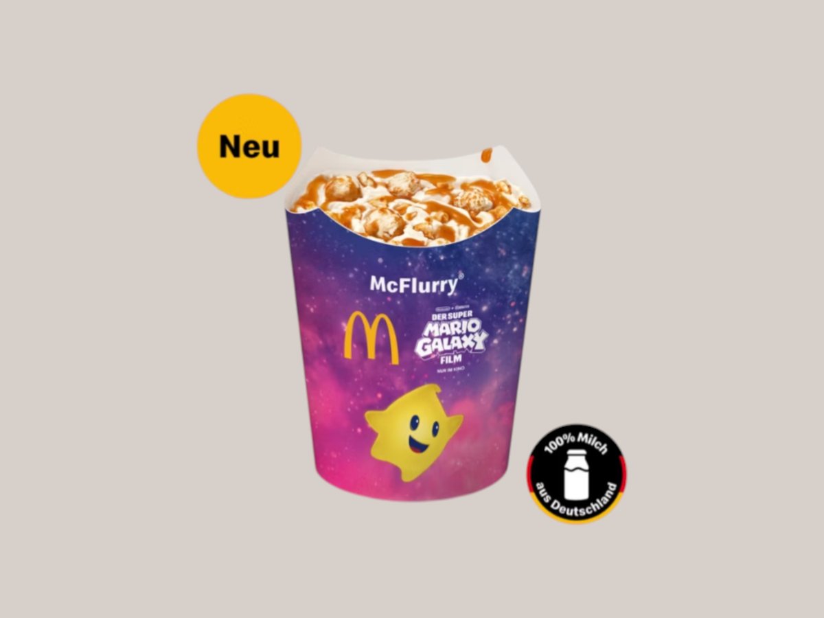 Erlebe ganz großes Kino mit dem neuen Highlight McFlurry® zum Super Mario Galaxy Film! Cremiges Softeis Original trifft auf Popcorn mit Karamell-Geschmack und köstliche Karamell-Sauce. Einfach der perfekte Snack zum Film!