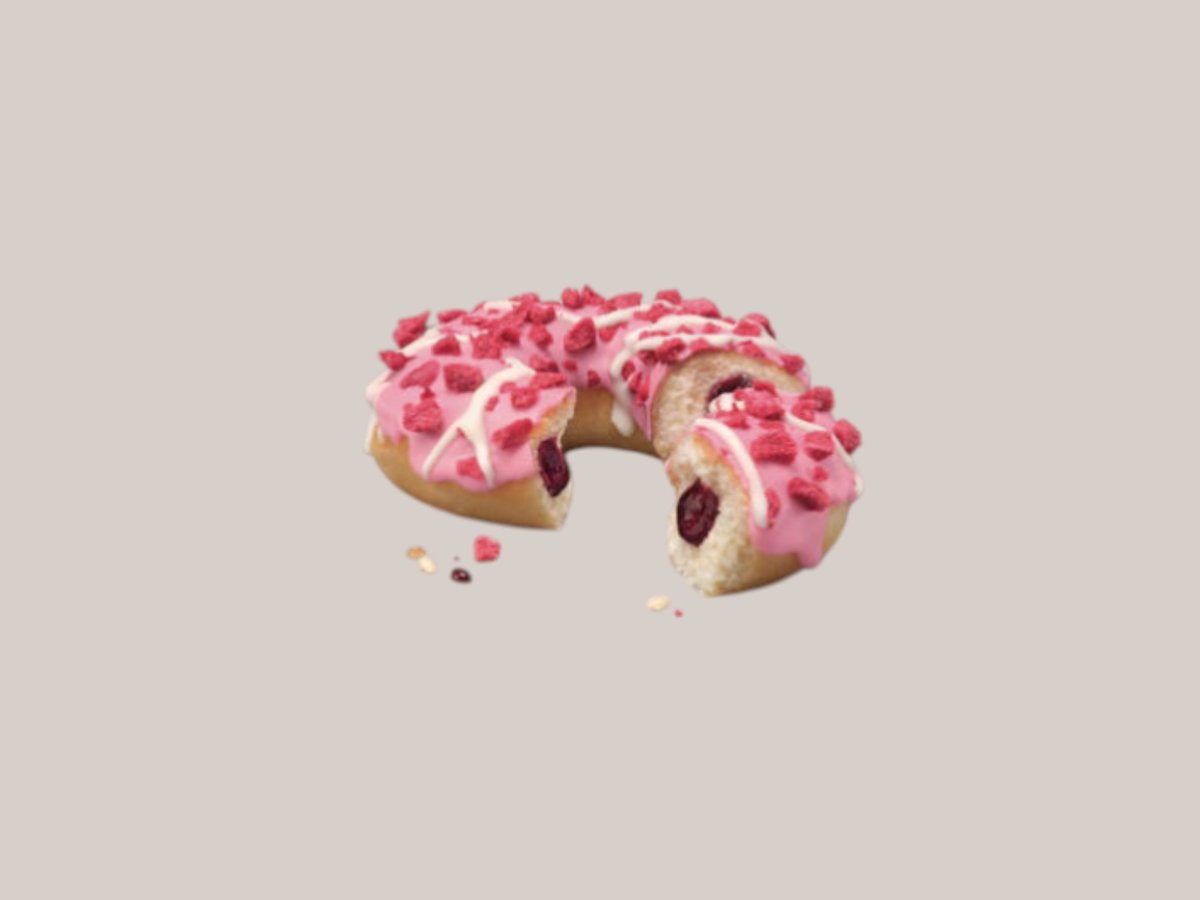 Der Name sagt alles: Hhmmbeer! Pinker Genuss, getoppt mit gefriergetrockneten Himbeerstückchen trifft auf eine fruchtige Himbeerfüllung. Ein fluffiger Donut voller Beerenpower!