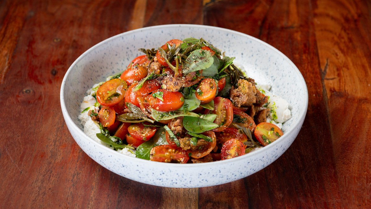 Xtipiti feta sauce, cherry tomato, cucumber, capers, red onion, black olives, oregano, carob crispy bread, lemon oil dressing