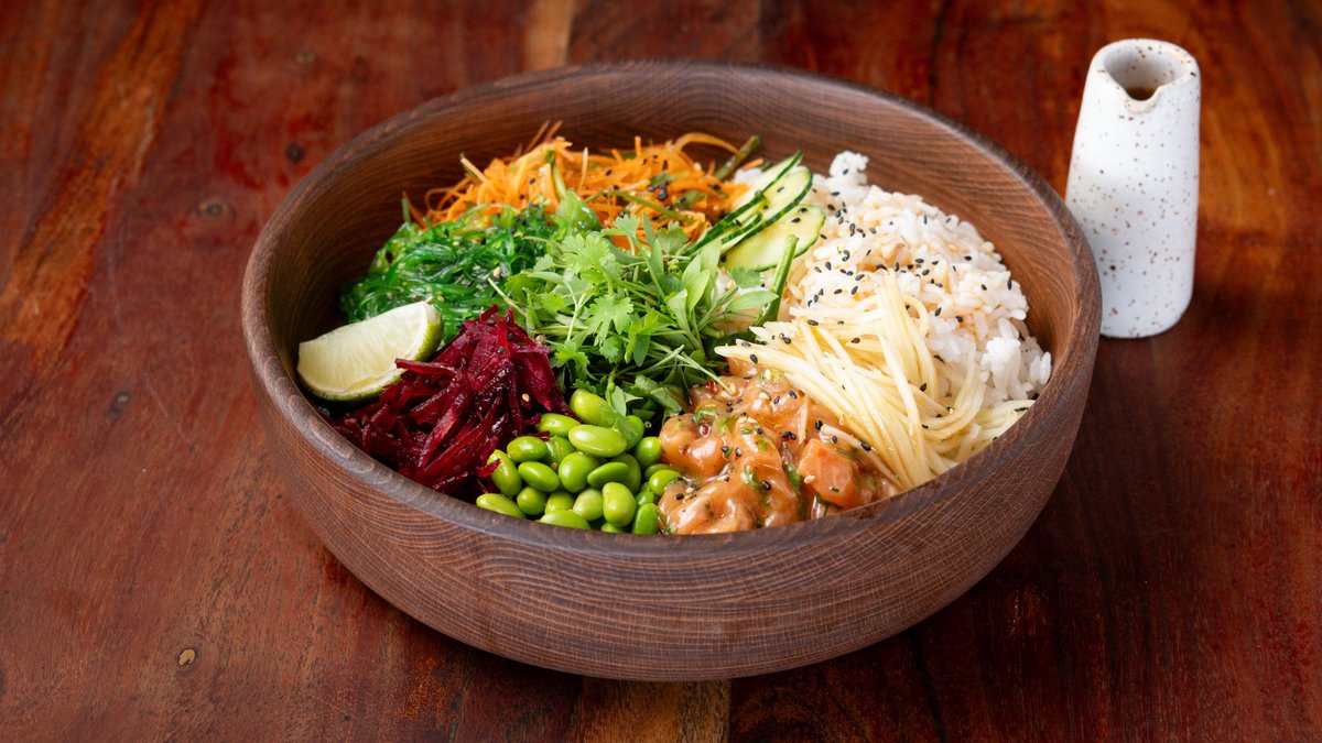 Sushi rice, avocado, mix leaves, coriander, asian sauce, wakame, cucumber, sesame, beetroot, green mango