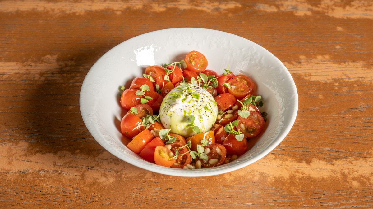 Tomato cherries, extra virgin olive oil, pine nuts, raspberry jam