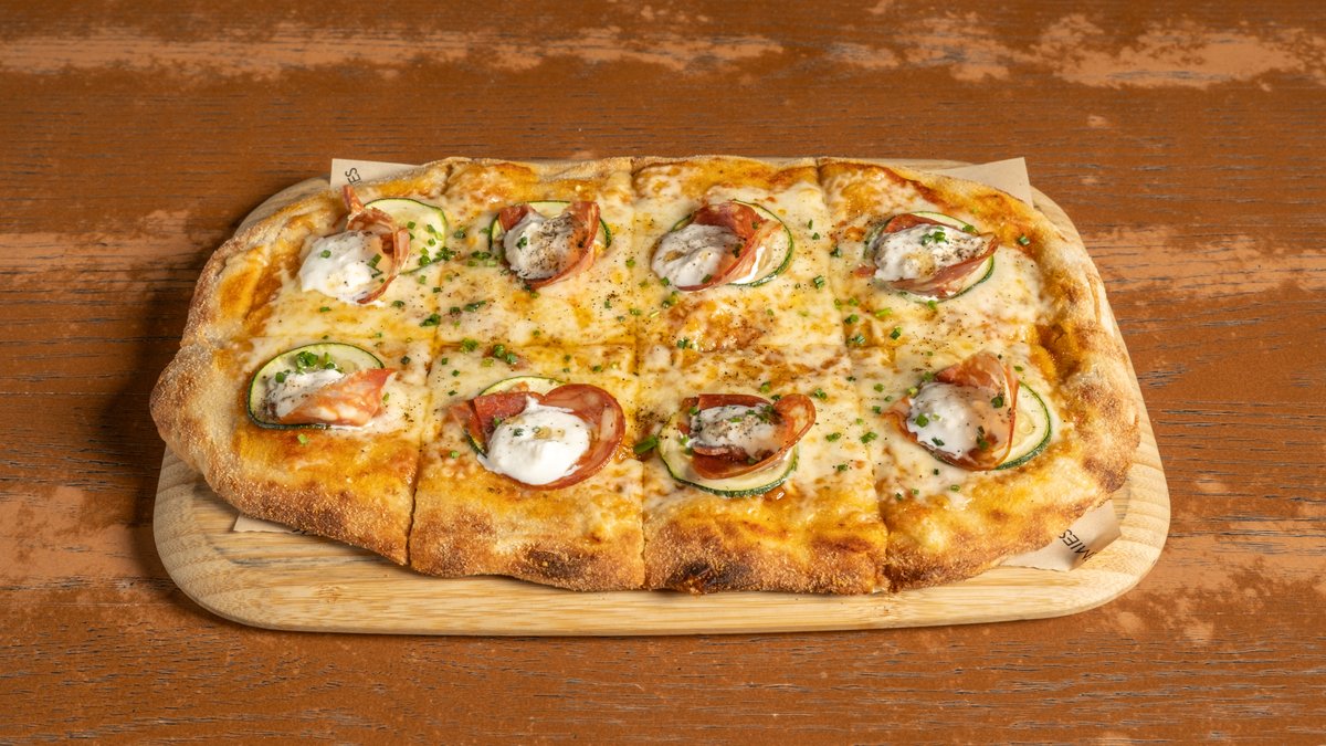 Handmade tomato sauce, Provolone cheese, zucchini, salami Spianata piccante, Stracciatella cheese, chili jam